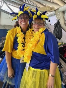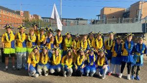 During breakfast the next morning we had to break the news that Max had been withdrawn from the team and would not be competing due to a medical emergency. Despite this, the team, wearing their distinctive harlequin jerseys, along with our president, assembled for the traditional group photograph on the hotel steps. Then we started the dressing up so we could arrive at Ponds Forge in style. Garlands, tutus and jester hats were adorned and in full flow.
